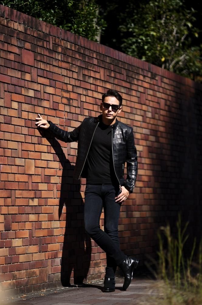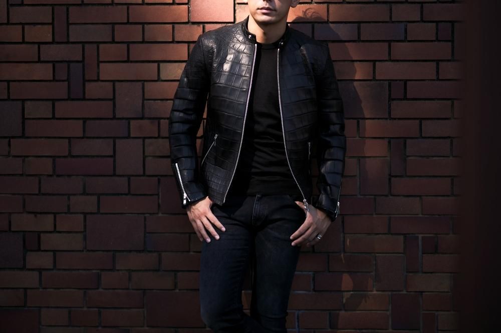 コチラのモデル「MAT CROCODILE SINGLE RIDERS No.T-132AL」はオイルカヴァメントソフトマットクロコダイルを使用したシングルライダースジャケット。