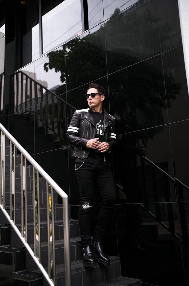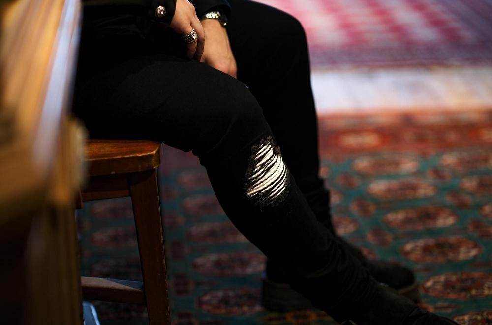 クラッシュ加工とホワイトストレッチフェイクレザーのリペアを施したグランジスタイルのデザイン。