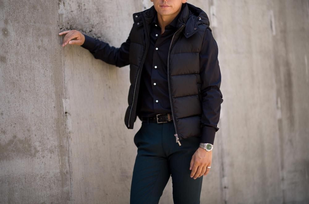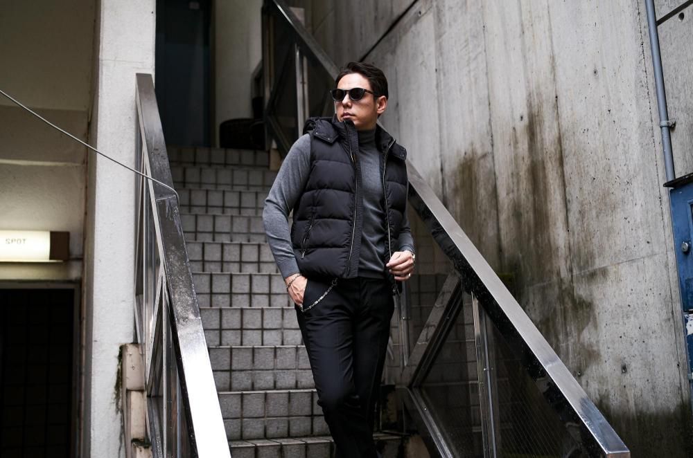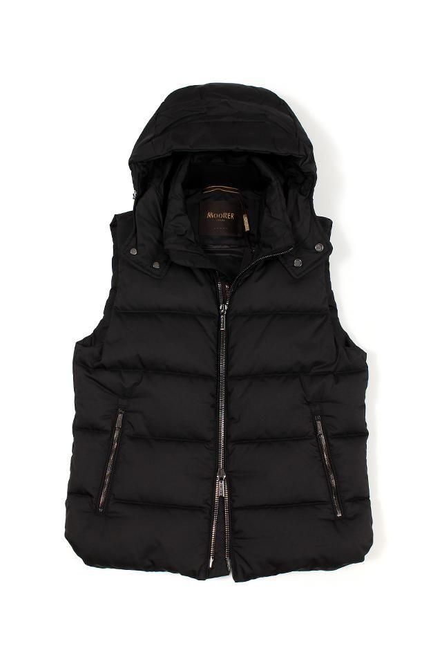 こちらのアイテムは「MOORER」の中でもカジュアルなスタイルで人気のフード付きダウンベスト。