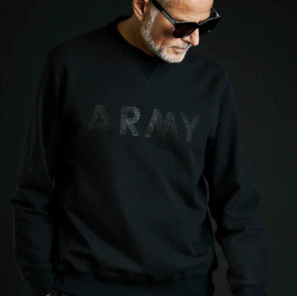 第二次世界大戦期には、米軍の兵士たちのトレーニングウェアやアカデミーの運動着として採用され、スウェットは軍と深く結びつく存在となりました。特に1950 年代までは襟元にV 字ガゼットが施され、汗止めや伸縮性補助の役割を果たしていました。以降、スウェットは大学や軍の体育着としてアメリカ文化に定着し、古着市場でも定番のアイテムとして扱われています。米陸軍(US ARMY)のトレーニングスウェットは、杢グレーを基調とし、胸部に「ARMY」と黒字でプリントされていることが特徴です。1990 年代から2000 年代にかけては、ポリエステル混の裏起毛ボディが主流となり、Soffe やRussell Athletic といったメーカーがコントラクターとして製造を担当しました。