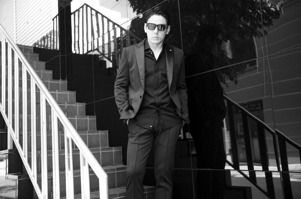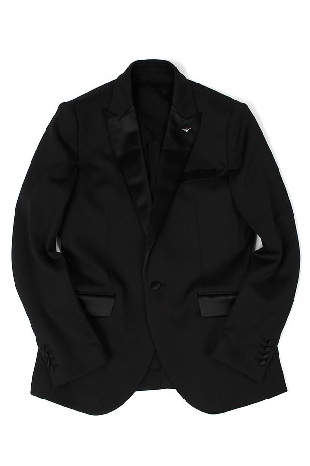 最大の特徴は異素材コンビのデザインで、ラペル、フラップ、ボタンにあしらわれたサテンがブラックカラーに奥行きを与えます。